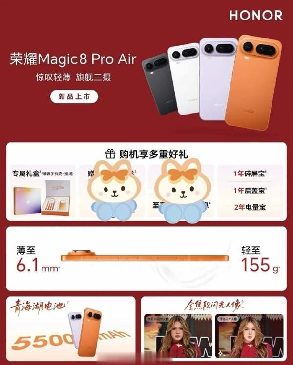 从荣耀Magic8 Pro Air的命名就能看出,该机主打Air级轻薄机身与Pro级配置体验,在轻薄设计下实现旗舰性能、长续航以及旗舰影像。