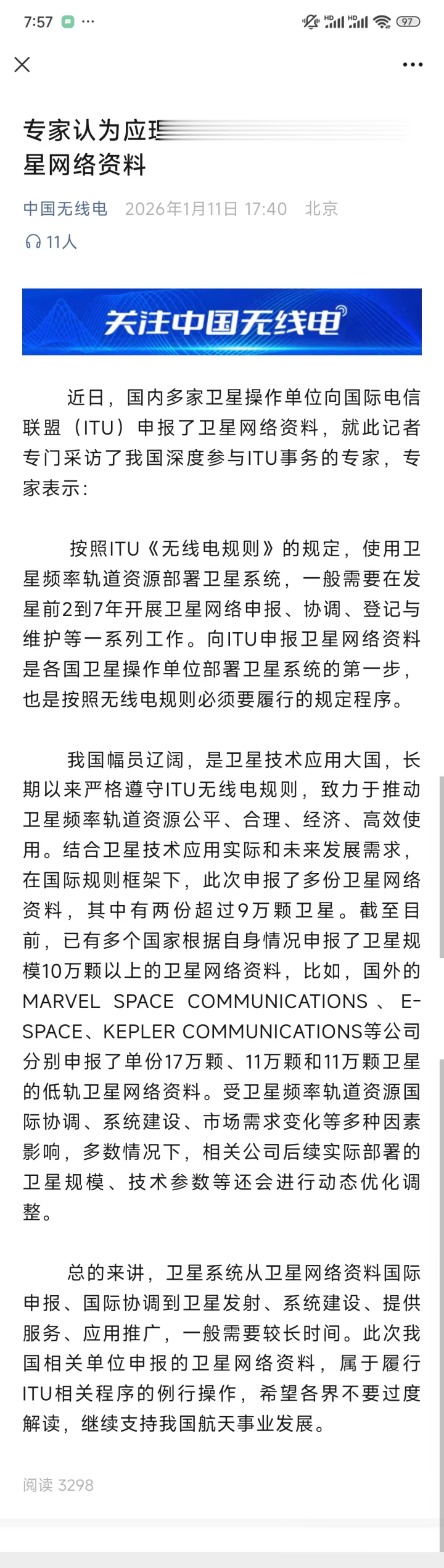 工信部旗下《中国无线电》杂志微信公众号1月11日发布文章《专家认为应理性看待中国新申报卫星网络资料》称,国内多家卫星操作单位向国际电信联盟(ITU)申报卫星网络资料,属于履行ITU相关程序的例行操作,希望不要过度解读。而且,卫星系统从卫星网络资料国际申报、国际协调到卫星发射、系统建设、提供服务、应用推广,一般需要较长时间。